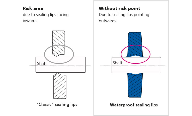 Waterproof shaft seals are the solution of choice for maximum hygiene and outstanding process reliability in industry. Specially developed for demanding applications in the food and pharmaceutical industries, the seals offer effective bidirectional protection that prevents the ingress and escape of particles. A clean product zone is ensured by retaining bearing grease and keeping the surface tension of the lubricant constant.
