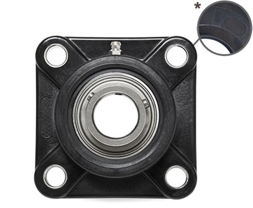 Die 4-Loch Gehäuseeinheit besteht aus einem abgedichteten Kugellager aus Edelstahl (Hochwertiger Werkstoff: 1.4125), lebensdauergeschmiert mit lebensmittelkonformer Fettfüllung NSF H-1 Freigabe, sowie einem Gehäuse aus thermoplasti-schem Kunststoff (PBT).