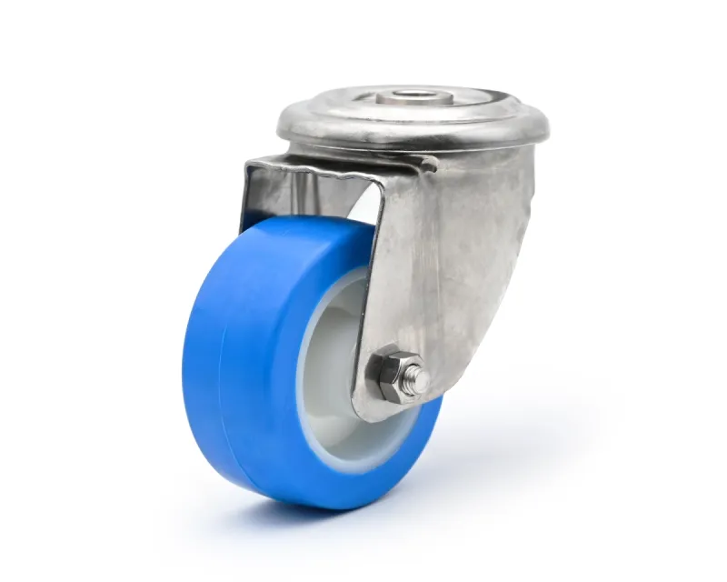 Lenkrolle, Edelstahl Gehäuse, Ø 125 mm, PU blau, 82 Shore, Gesamthöhe 155 mm