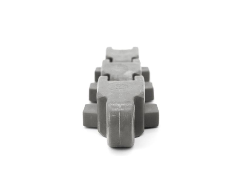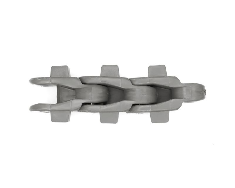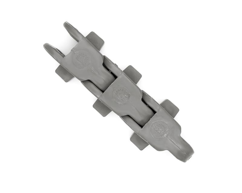 Die Knochenkette 2500 TAB aus grauem POM überzeugt durch eine Teilung von 63,5 mm und eine Bundlänge von 3,56 Metern, ideal für präzise Anwendungen in technischen Serien.